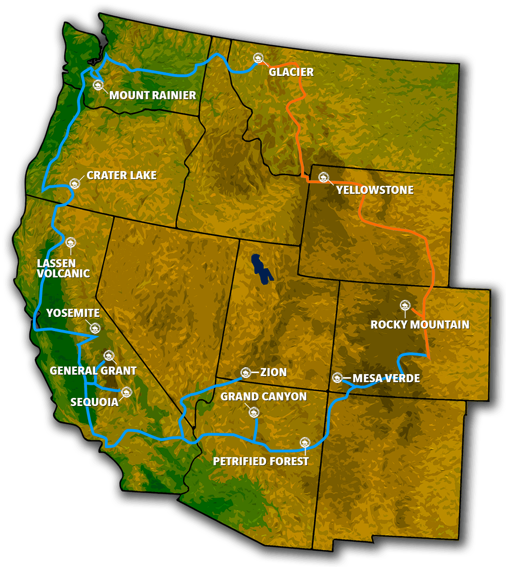 Beginning in Denver on August 26th, the trip would take the group through Rocky Mountain, Yellowstone, Glacier, Mount Rainier, Crater Lake, Lassen Volcanic, Yosemite, General Grant, Sequoia, Zion, Grand Canyon, Mesa Verde, Petrified Forest and back to Denver.